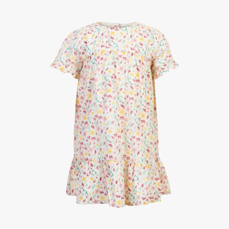 Hvit kjole med lilla, gult og grønt blomstrete mønster. Består av 100 prosent bomull.