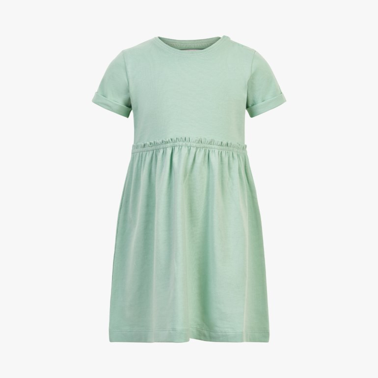 MinymoSkjønn mintgrønn bomullskjole med glitrete stoff og to små paljettblomster på brystet. Rysjekant og innsvinget midje gir en fin passform.