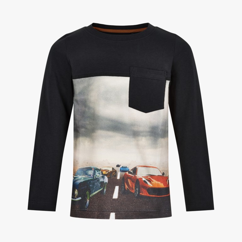 Kul genser med fotoprint av to racerbiler. Genseren har lange ermer og en brystlomme. Ermer og bryststykket er sort. Fås i str. 92-128. 95 prosent bomull og 5 prosent elastan.