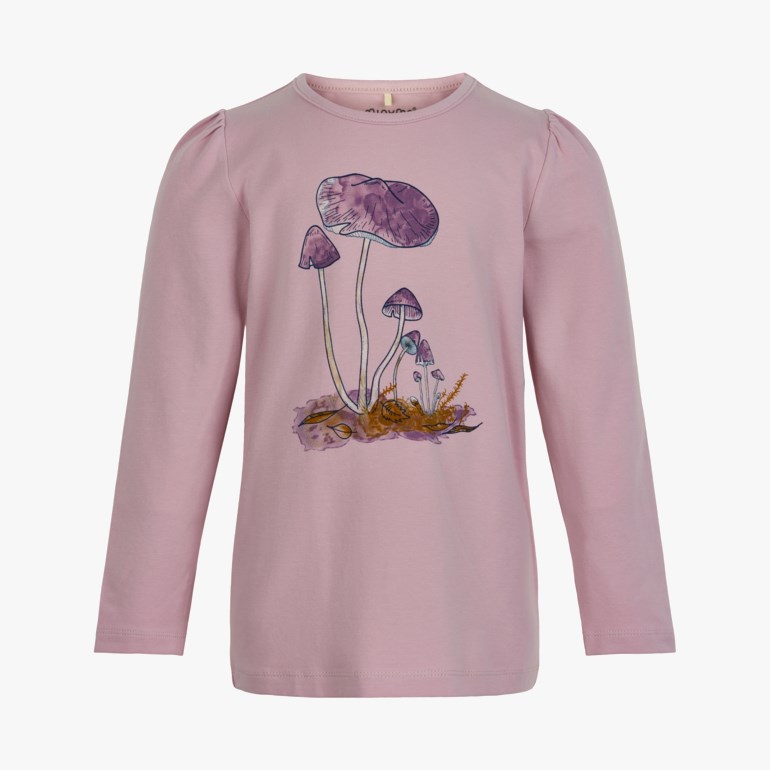 Fin bluse med stort print av skogssopp på brystet. Blusen er fremstillet i 95 prosent økologisk bomull og 5 prosent elastan. Myk og elastisk kvalitet. Bunnfargen er rosa.