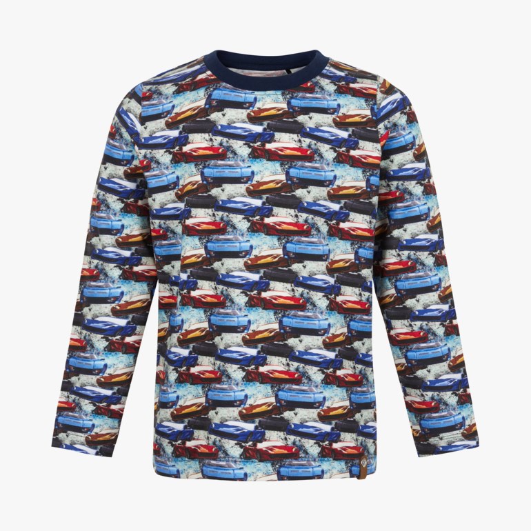 Tøff genser med all over print av racerbiler. Fås i str. 92-128. 95 prosent bomull og 5 prosent elastan.