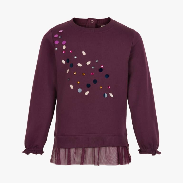 Søt sweatshirt med myk innerside. Blusen har fin glittereffekt på forsiden og rysjekant av tyll nederst. 95 prosent bomull og 5 prosent elastan. Fås i str. 92-128.
