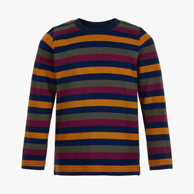MinymoT-shirt med lange ermer og smale horisontale striper i bordeaux, mørk blå, pumkin spice og grønn.