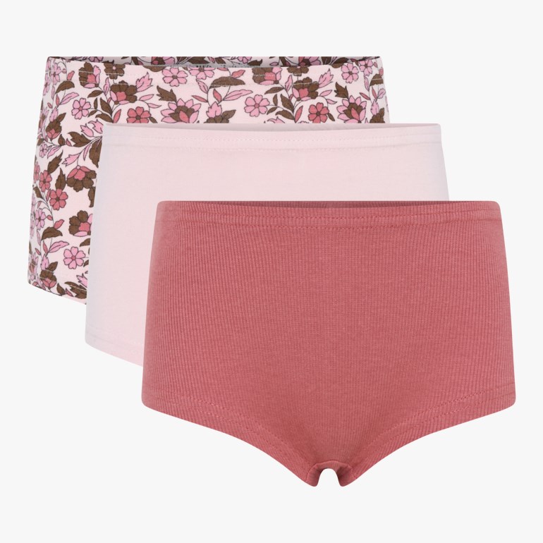 Tre stk hipstertruser i ribbkvalitet, laget i økologisk single jerseybomull. I pakken får du to ensfargede og en mønstret hipstertruse.