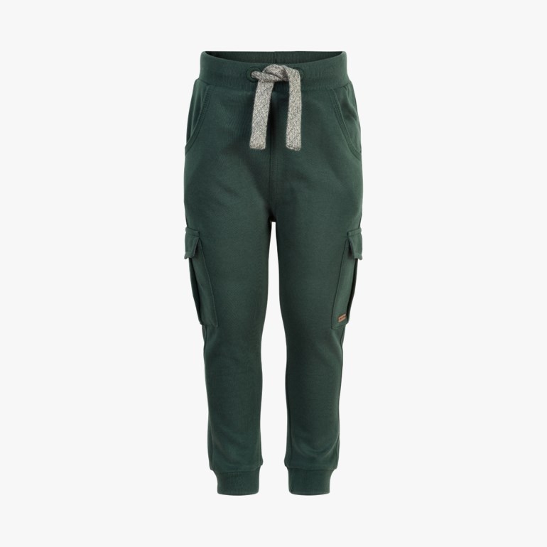 Mørkegrønn joggebukse med lommer på siden av benene. Joggebuksen har elastikk og snøring i livet. Myk og behagelig kvalitet. 100 prosent bomull.