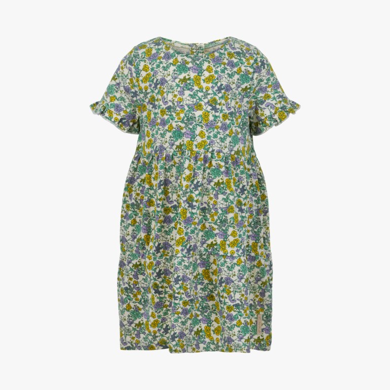 Søt småblomstrete kjole med korte ermer og rynket skørt. Fine rysjer nederst på ermene. Kjolen er fin til leggings eller bukser. Kommer I str. 92-128 i farge småblomstrete gul,lilla,grønn. Den er laget av 95 prosent økologisk bomull jerseyog 5 prosent elastane som gir kjolen en myk og fleksibel passform.