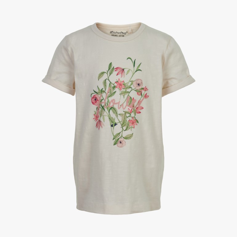 Ensfarget t-shirt med korte ermer med oppbrett, og blomsterprint foran. Ribkant ved halsen og single jersey bomull gir plagget en myk og fleksibel passform.