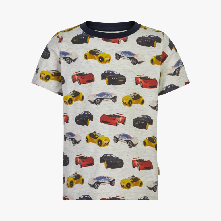 Beige t-shirt i myk bomullstretch med racerbiler i mange farger. 85 prosent bomull, 10 prosent polyester, 5 prosent elastan. Str. 92-128