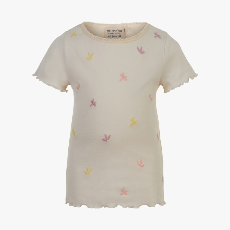 Ensfarget t-shirt i rib med korte ermer og broderte detaljer over det hele. Den har bølgete kanter ved ermene og nederst. Fin blondekant ved halsen.