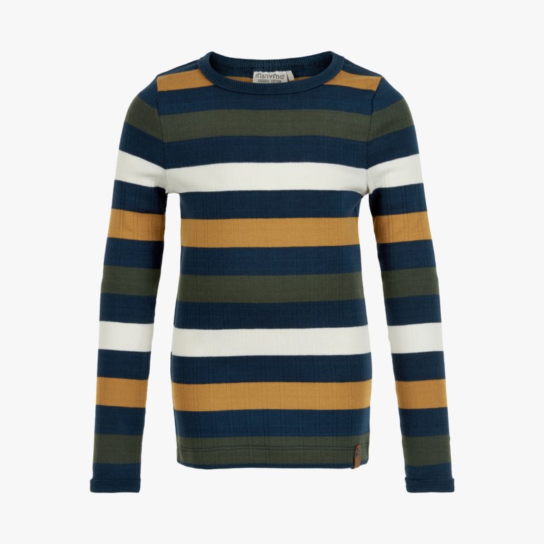 Genser i bomullsribb med brede striper. Myk ribbekant ved halsen. Fargene er mørk blå, grønn, gul og hvit. Fås i str. 92-128. 95 prosent bomull og 5 prosent elastan.
