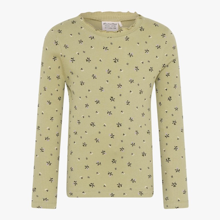 Langermet, ribbestrikket genser av økologisk bomull. Genseren kommer med blomstrete mønster og har rysjete hals og knapp bak i nakken.