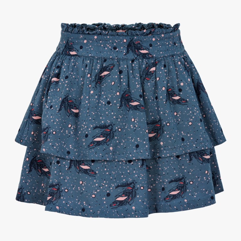 Blågrått skjørt med fjærmønster. Myk kvalitet og strikk i livet. Inneholder 100 prosent viskose.