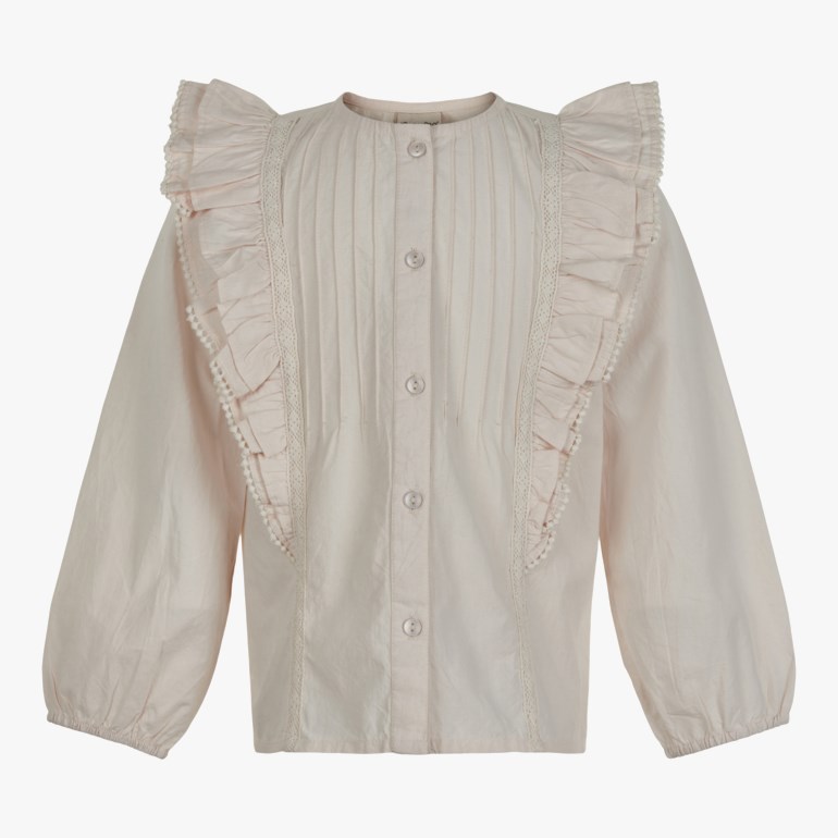 Nydelig skjorte med flere fine detaljer, bla. vertikale skjæringer og rysjer på forsiden, over skuldrene og ned bak. 100 prosent bomull. Fås i str. 92-128.