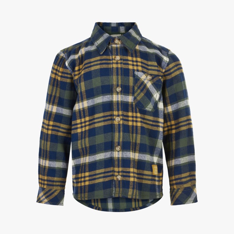 Tøff rutet skjorte. Skjorten er vevet i ren bomull og er myk og behagelig å ha på. Fargene er mørk blå, grønn, gul og hvit. Fås i str. 92-128. 100 prosent bomull.