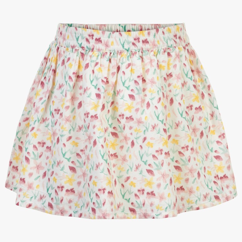 Vakkert,lett og luftig sommerskjørt, med blomstrete mønster i lilla, gult og grønt. Består av 100 prosent bomull.