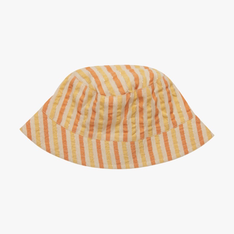 Stripete sommerhatt i lillemartine-stoff med glitterdetaljer. Hatten har skygge hele veien rundt.