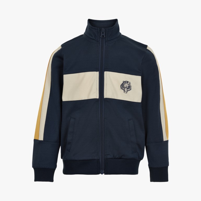 Sweat jakke med glidelås, med striper på ermer og bryst. 50% Cotton/ 50% Polyester