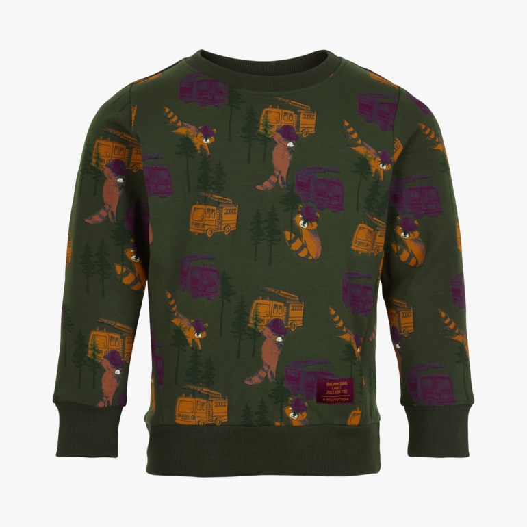 Skjønn sweatshirt med kult all over print som er et brannmannsmotiv. Bunnfargen er mørk grønn, og printet er bordeaux og pumpin spice. Ribbkanter ved hals, håndledd og nederst. 95 økologisk prosent bomull og 5 prosent elastan. Fås i str. 92-128.