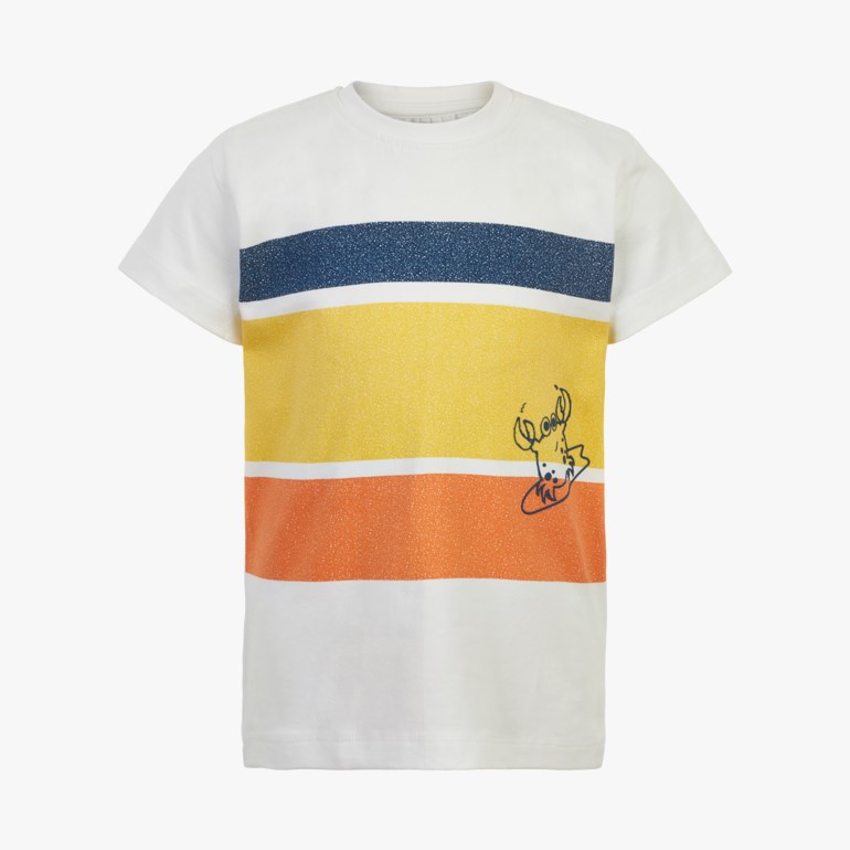 Hvit t-skjorte med 3 striper på brystet i mørkeblått, gult og oransje, over stripene er det et lite print av en morsom krabbe. Består av 95 prosent organisk bomull og 5 prosent elastane.