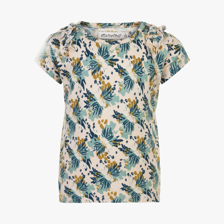 T-shirt i myk bambuskvalitet. Blomstrete med rusjer på skuldrene. 95 prosent Bambus/viscose og 5 prosent elastan. Str. 92-128.
