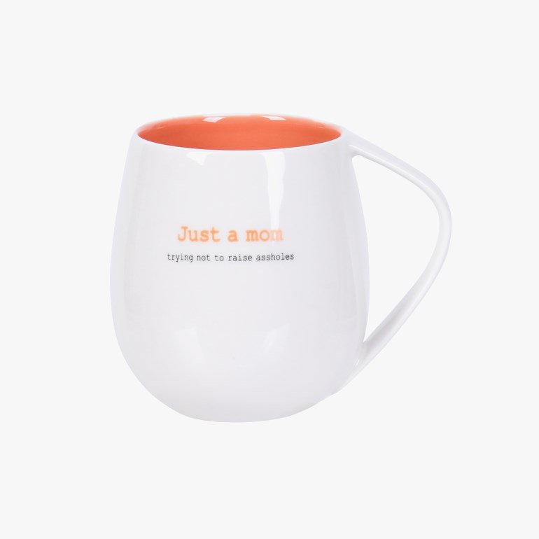 Morsomt kopp med hank, med rosa innside, hvit utside og dekorert med teksten "Just a mom trying not to raise assholes". Koppen er laget i porselen, rommer 280 ml og er perfekt som gave til bursdag, jul eller morsdag. Tåler vask i oppvaskmaskin.