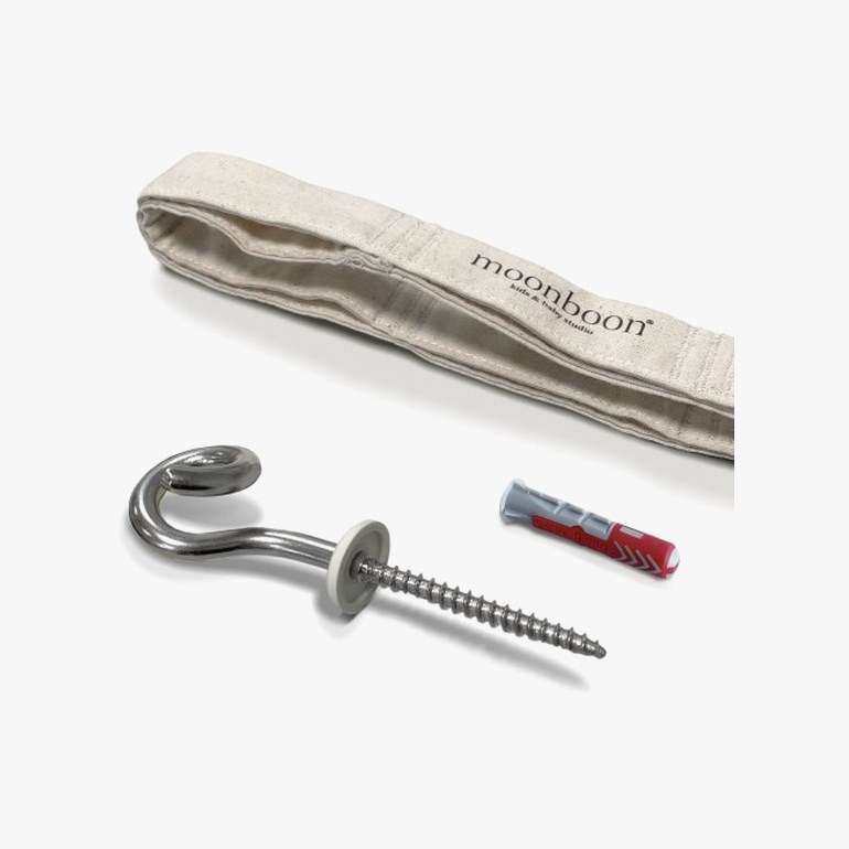 Moonboon Opphengssett til hengevugge inkluderer en takkrok i rustfritt stål og en slitesterk opphengsstropp i bomull og nylon, slik at du trygt og trygt kan montere babyvuggen til tretak, betongtak og trebjelker. Justerbare innstillinger gir deg en sikker og diskret måte å installere hengevuggen hjemme.