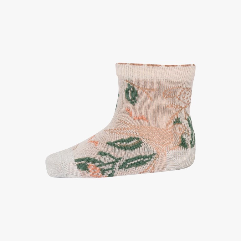 Vakre og myke babysokker i viskose-bambus fra mpKids med et nydelig mønster med papegøyer som sitter på blomstrende blomstergrener. Sokkene er av velkjent høy kvalitet, noe som gjør dem behagelige mot huden. Den brede øvre strikken sørger for at sokkene holder seg hele dagen med spilling. Forsterket hæl og tå sikrer god slitestyrke.