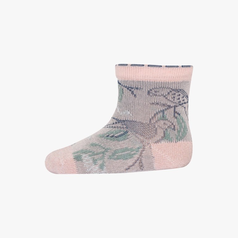 Vakre og myke babysokker i viskose-bambus fra mpKids med et nydelig mønster med papegøyer som sitter på blomstrende blomstergrener. Sokkene er av velkjent høy kvalitet, noe som gjør dem behagelige mot huden. Den brede øvre strikken sørger for at sokkene holder seg hele dagen med spilling. Forsterket hæl og tå sikrer god slitestyrke.