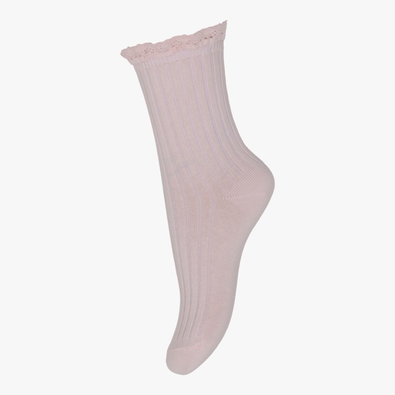 Julia sokk i ribb med en søt liten blondedetalj. Forsterket hæl og tå for god slitestyrke og en myk og glatt søm på innsiden av tåen for komfort.