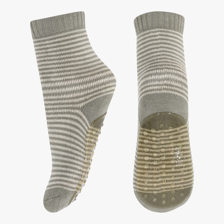 Denne klassiske antisklisokken med pene små striper. Hjelper med å få barnet på beina med antisklidetaljene under foten. Slitesterkt og mykt garn som sikrer et godt produkt selv etter mye bruk.