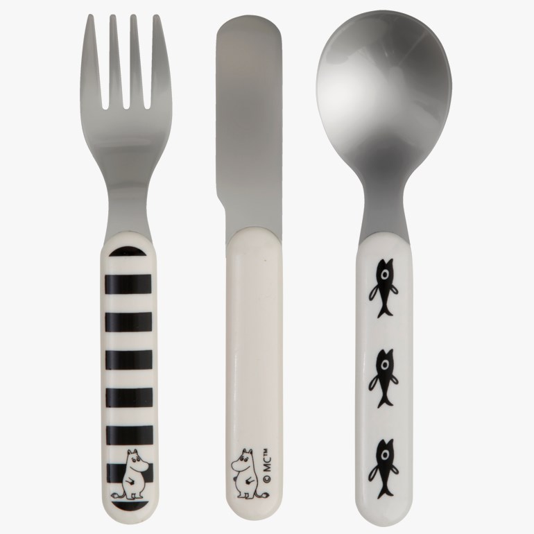 Et praktisk og sjarmerende bestikksett med klassiske Mumin-illustrasjoner. Settet inneholder skje, gaffel og kniv i barnevennlig størrelse, laget spesielt for små hender som øver på å spise selv.