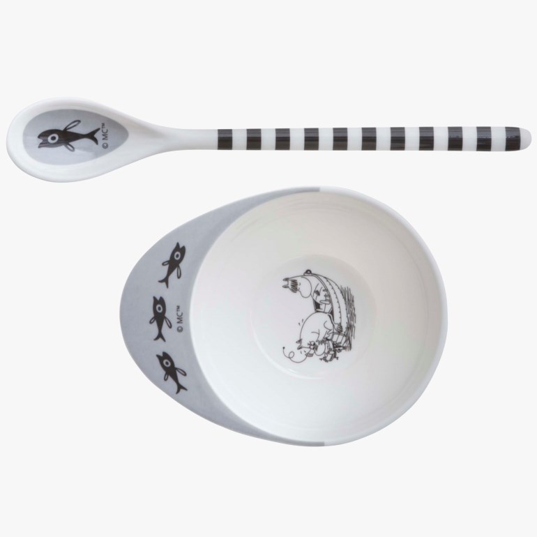 Dette spisesettet med skål og skje er utviklet for barn som skal begynne med fast føde. Den lange skjeen gjør det enkelt å mate barnet, også rett fra barnematsglass, og skålen har en praktisk størrelse til de første små måltidene.