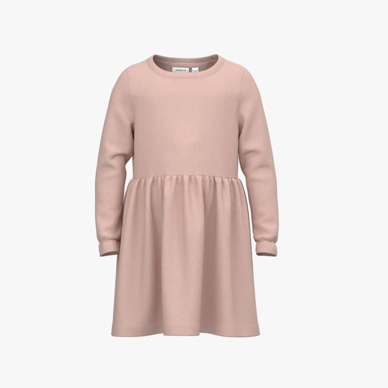 Langermet, knelang kjole med rund hals fra Name It, med strikk i ermene og innsnøring i livet.