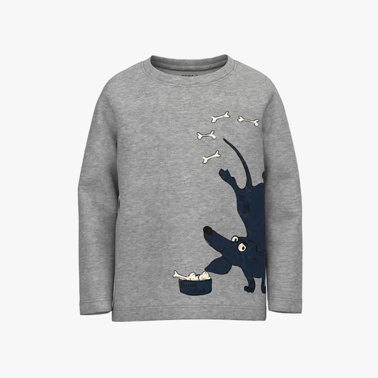 Langermet genser i jerseybomull, med rund hals og morsomt hundeprint fra Name It. Jersey er et lett og elastisk stoff med en myk overflate og innside for en behagelig følelse og bevegelsesfrihet.