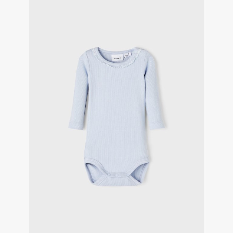 Body med trykknapplukking mellom benene. Blondedetaljer og med O-hals.