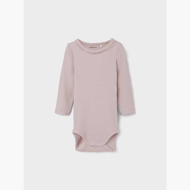 Body med trykknapplukking mellom benene. Blondedetaljer og med O-hals.