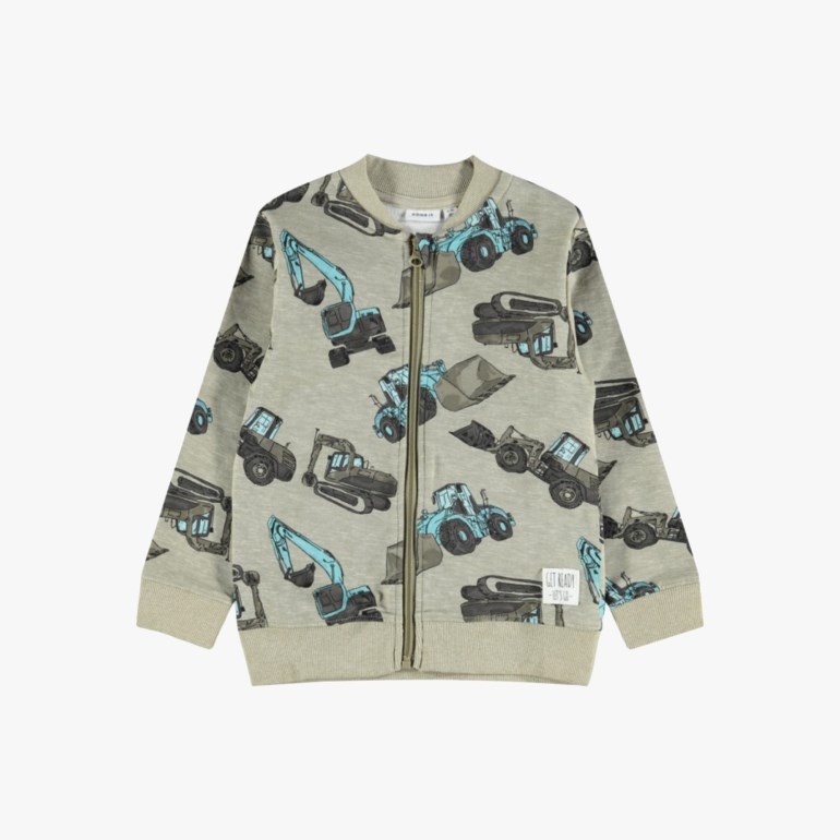 Kul jakke fra Name It med maskiner. Materiale: 95% organisk bomull, 5% Elastane