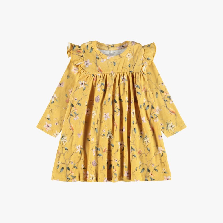 Name It Fiola langermet kjole med rysjer på skuldrene. 57% Organisk Bomull, 38% Modal og 5% Elastan.