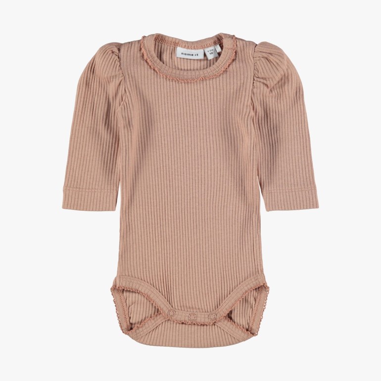 Langerme body med rund hals. Stoff i ribbestruktur og med trykknapper i skrittet.