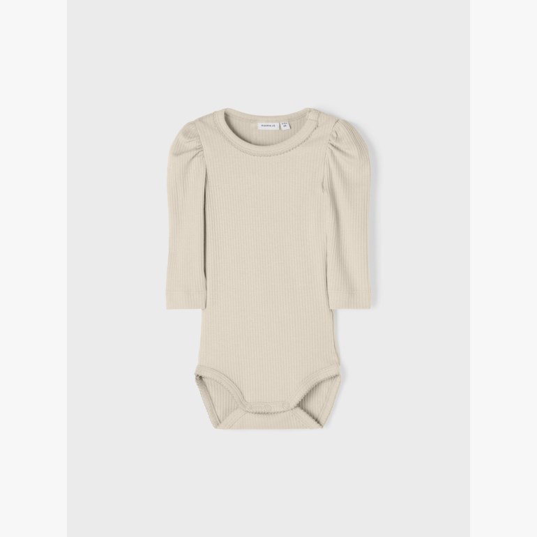 Langerme body med rund hals. Stoff i ribbestruktur og med trykknapper i skrittet.