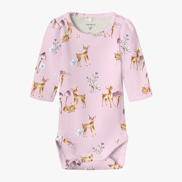 Langermet body med søtt dyreprint over hele og trykknapper mellom benene for en lettere av og på kledning. Ribbestrikk har vertikalt, stripete mønster og god elastisitet for en behagelig følelse og et tidløst utseende.