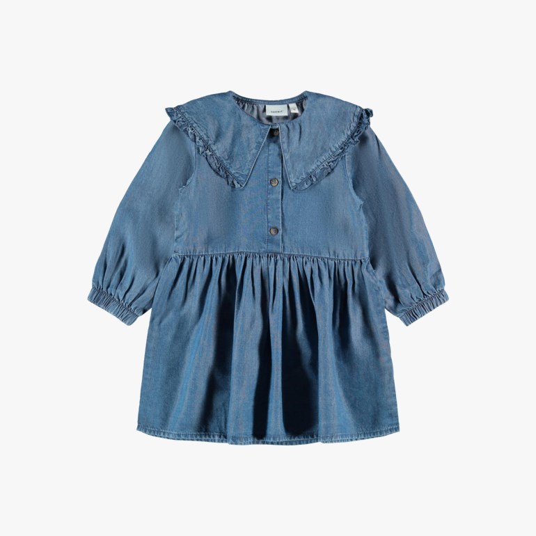 Langermet kjole med lett, vevd denimkvalitet. Trykknapper foran og krage med volanger.