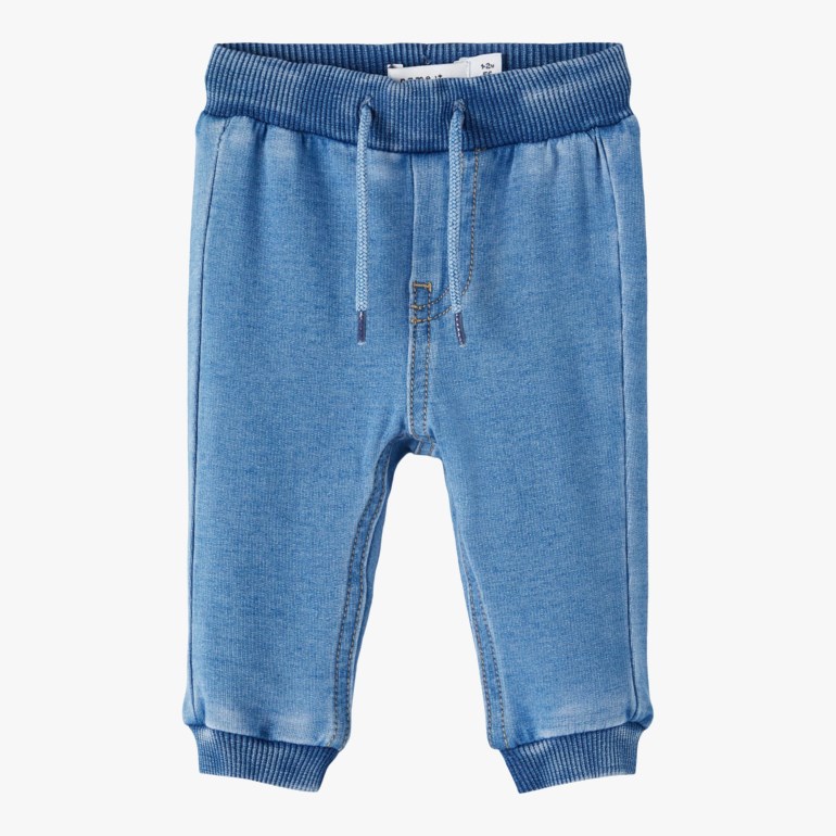Myke, baggy denimbukser til baby. Justering i livet og strikk ved anklene sørger for at buksen holder seg på plass.