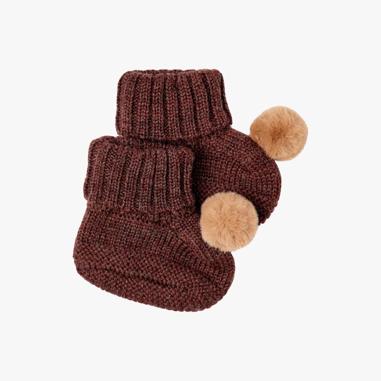 Tøfler i myk merinoull, med strikkede detaljer og dusk. Perfekt til bruk som et ekstra lag på kalde dager, både innendørs og i vognen.