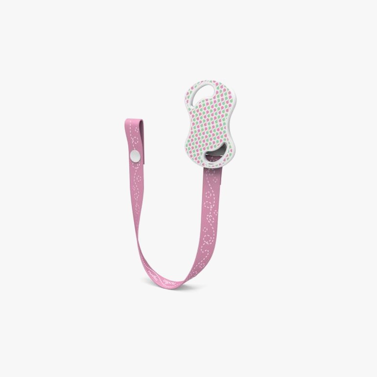 Smokkholder med knapp som passer til smokker med ring og biteleker. Den er enkel å montere og legger ikke igjen merker på barnets klær.