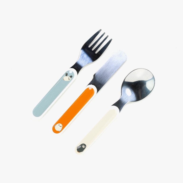 Barnebestikk lagd i ABS-plast og rustfritt stål. Kniv, gaffel og skje som passer fint i en barnehånd.