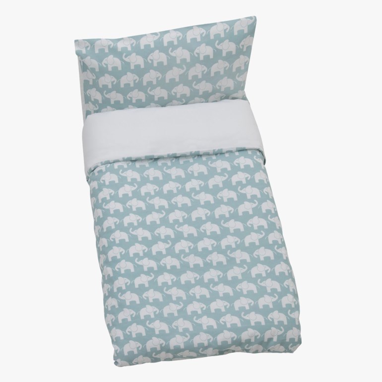 Sengesett i 100% økologisk, GOTS-sertifisert bomull. Settet kommer med både dyne- og putetrekk og begge deler er dekorert med søte elefanter. Baksiden er hvit. Passer perfekt til bruk i sprinkelseng.