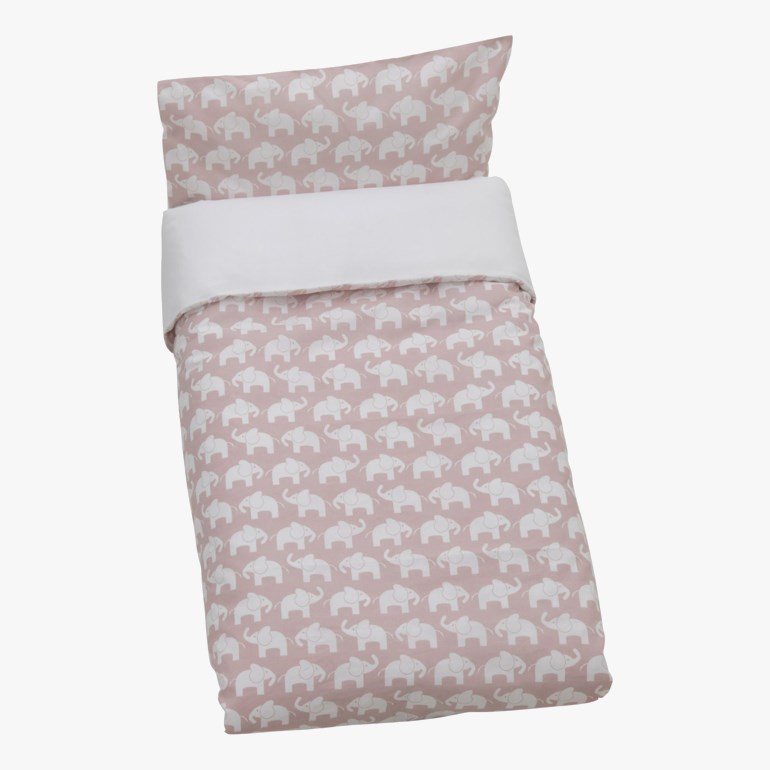 Sengesett i 100% økologisk, GOTS-sertifisert bomull. Settet kommer med både dyne- og putetrekk og begge deler er dekorert med søte elefanter. Baksiden er hvit. Passer perfekt til bruk i sprinkelseng.