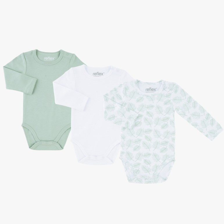 Myk body i 3-pakning laget i 100% økologisk bomull. Åpning på ene skulderen og i skrittet med trykknapper. Pakkene består av forskjellige ensfarget og mønstret design. Produktene er Økotex- og GOTS-sertifisert. Str. 56-98