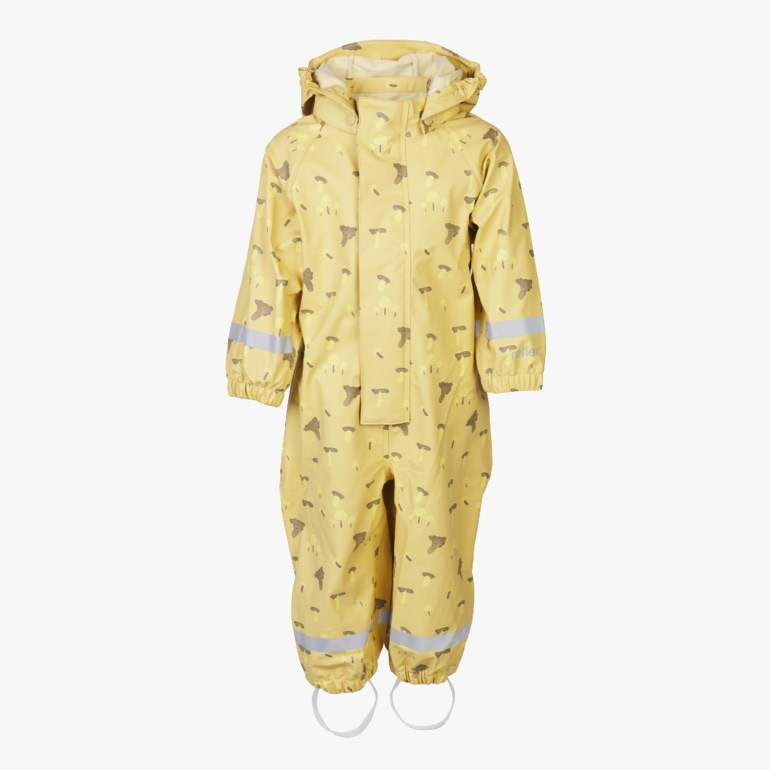 Mønstret regndress i myk og solid PU-kvalitet med sveisede sømmer produsert i resirkulert materiale. Tekstilet har vannsøyle på 18.000mm og alle sømmer i plagget er sveiset.